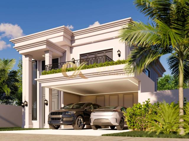 A fachada moderna e elegante se destaca pelo design sofisticado, com varanda superior, detalhes arquitetônicos refinados e garagem coberta para dois veículos.